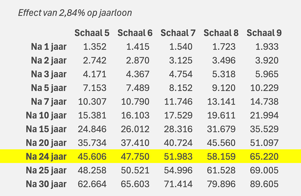 👉 Een gemiste loonsverhoging van 2,84% (vergelijkbaar met de pensioenindexatie dit jaar) verdwijnt niet na één jaar.